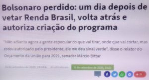 – Segundo o senador Márcio Bittar, relator do Orçamento, o Mito lhe deu carta branca pra criar um novo programa social para 2021, um programa que substitua o Bolsa Família e que não tenha o nome de Renda Brasil, certamente. É preciso desenhar, Guedes e Waldery?