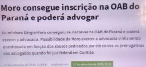 (bleorgh.com) – A notícia critica mas não esclarece: Sérgio Moto obteve inscrição como advogado na OAB/PR. Explicava que muitos advogados discordam disto, pelas atitudes dele como juiz. Minha dúvida é outra: ele fez o teste obrigatório pra se inscrever na OAB e passou? Ou não?