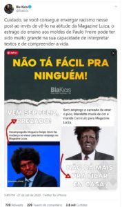 (bleorgh.com) – Fantástica a explicação da Bia Kicis para o post em que ela pintou Moro e Mandetta de negros à procura de empregos. No mundo que ela vive, brancos não buscam empregos e traidores são sempre negros… E ela jura que não é racista!