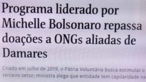 (bleorgh.com) – Pátria Voluntária, programa de governo liderado pela 1ª Dama, sem edital de concorrência, repassou R$401 mil de doações privadas a instituições evangélicas aliadas da dona Damares. O endereço de uma delas, AMTB, é o mesmo da ATINI, ONG fundada pela ministra.