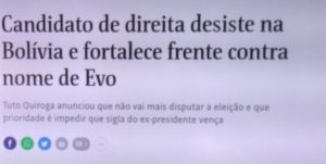 – Pra tentar evitar o retorno de Evo Morales ao poder, dois dos candidatos, incluindo a presidenta em exercício, renunciaram às candidaturas. Enquanto isto no Brasil, a esquerda se divide cada vez mais. Ficar na oposição é bem mais fácil que dividir o poder, né mesm…?