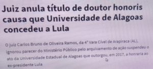 (bleorgh.com) – Um juiz de uma comarca do interior pode anular uma decisão de uma universidade estadual 04 anos depois, atendendo o pedido de uma candidata a vereadora da capital? Um juizeco de Arapiraca, a pedido de uma candidata do PSDB, cassou o título honoris causa de Lula.