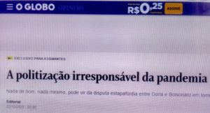 (bleorgh.com) – De O Globo de hoje: ‘É um desrespeito com o brasileiro que a pesquisa de vacinas contra a Covid-19 — questão científica — tenha se transformado numa disputa política estapafúrdia entre Jair Bolsonaro e João Doria.’ Você acha que a Globo decidiu fazer jornalismo sério?