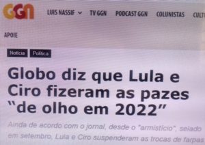 (bleorgh.com) – Interessante, mas não surpreendente, a posição d’O Globo sobre as pazes entre Lula e Ciro Gomes. Paz e guerra fazem parte do jogo político brasileiro e mundial. Só O Globo faz questão de ressaltar que a paz entre Lula e Ciro tem interesse eleitoral…
