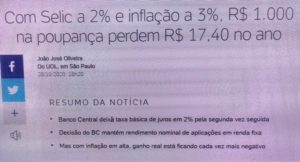 – Parece que o neo liberalismo guediano, depois que virou governo, não pensa assim. A inflação está caminhando pra 3%, mas o Banco Central manteve a taxa Selic em 2¢%. Com isso, R$1 mil na poupança perdem R$ 17,40 no ano. O povo que consegue poupar vai pra onde? Pra Bolsa?