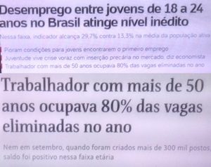 (bleorgh.com) – A taxa de desemprego no Brasil hoje tem duas faces horríveis: 30% dos jovens entre 20 e 24 anos não consegue se empregar e a imensa maioria de demitidos este ano foi de trabalhadores acima dos 50 anos.