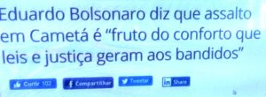 – Com os assaltos espetaculosos a bancos em cidades do Interior, os bolsonários, Dudu 03 à frente, exigem leis mais rígidas no Brasil. Não seria mais cristão propor políticas de apoio à implantação de prisões mais humanas e à reeducação de bandidos pra reinserção na sociedade?
