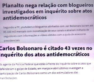 – …a mesma PF indica que Carluxo, o 02, o vereador do Planalto, é citado 43 vezes no inquérito sobre os atos anti democráticos de abril e maio, que pregavam golpe de Estado, alguns deles prestigiados pelo Mito. É só juntar as peças…