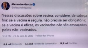bleorgh.com) – Me causa vergonha que um jornalista tarimbado, famoso por ter estrelado o jornalismo da Globo durante anos, escreva algo tão idiota quanto isto, contra a vacinação, como se o problema fosse este:” os vacinados não serão contaminados pelos não vacinados”.