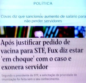 – Já o supremo ministro Fux, depois de dar entrevistas “tentando justificar” o pedido de reserva de 7.000 vacinas pra ministros e funcionários do STF, exonerou o funcionário responsável pelo pedido, dizendo que “foi um choque” para ele, que não sabia do pedido. Triste Brasil!