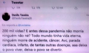 bleorgh.com – Como entender uma pessoa que diz que 200 mil mortes pela pandemia não significa nada porque todo dia morre gente de acidente, câncer, Avc, parada cardíaca, infarto… Pergunta direta pro imbecil: já avisou à família que se você tiver AVC ou câncer, é pra te deixar morrer?