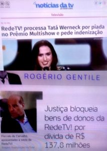 bleorgh.com – Os donos da RedeTV, que mantêm o programa do Lacombe, apesar de audiência nula, estão acusando de deboche e pedindo indenização a R$50 mil a Tatá Weneck, por uma fala dela no Prêmio Multishow 2020: que o vestido usado por ela custava “uma grade” da emissora.