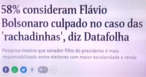 bleorgh.com – Pesquisa Datafolha indica que 58% dos brasileiros consideram Flávio 01 culpado de corrupção nas rachadinhas. Ou seja, 42% o consideram inocente (11%) ou tiveram medo de se manifestar ou não acham nada (31%) .
