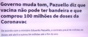– Agora, muda o disco: comprou a vacina comunista e vai vacinar 46 milhões a partir de abril e mais 54 milhões em 2021. Parem e pensem: no caos que o Brasil já está, revoltas pipocarão antes de abril, a Cavalaria vai pras ruas e o salvador começa a vacinar em abril… Uh! Uh! Ah! Ah! Mitôôôô!!!