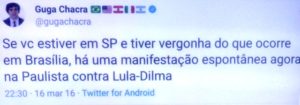 – Há uma diferença óbvia, claro! Lá, a imprensa faz cobertura, aqui a imprensa apoia um lado… Conceito do Guga pra manifestação espontânea: aquela convocada pela Globo.