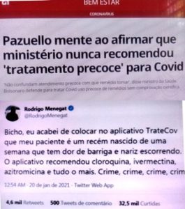 – Seu ministério tem um aplicativo, TrateCov, pra auxiliar no diagnóstico da covid19. E tem muitas postagens nas redes mostrando que qualquer consulta indicando algum sintoma – tosse, diarreia, cefaleia, dor nas costas – o aplicativo indica tratamento com cloroquina e vermífugo.