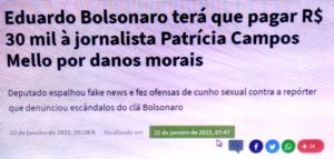 bleorgh.com – Dudu 03 foi condenado pela Justiça a pagar R$30 mil à renomada jornalista Patrícia Campos Mello como indenização por danos morais. Em maio/2020, ele falou no “Terça Livre” que ela ‘tentava seduzir’ para obter informações que fossem prejudiciais ao seu pai.
