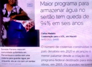 – Este programa, criado em 2003 e premiado mundialmente, construiu, em 2014, 149 mil cisternas para captação e armazenamento de água em todo o sertão, número que caiu, em 2020, para 8.310, uma queda de 94,5%. Não é atoa que a elite precisava destruir o PT e prender o Lula…