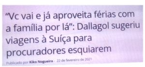 – Num dos posts (07/12/2017), Dallagnol, o chefe, escreve que é preciso indicar voos para 2018 pra consumir valores de passagens (e diárias)… “Quanto mais gastarmos agora, melhor.” Noutro (28/10/2016), ele sugere: “Vc vai (à Suíça) e já aproveita férias com a família por lá…”