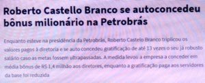 bleorgh.com – O que é corrupção realmente? O demitido presidente da Petrobras triplicou os valores pagos à diretoria e se auto concedeu gratificação de até 13 vezes o seu já alto salário caso as metas estabelecidas pela diretoria fossem ultrapassadas.