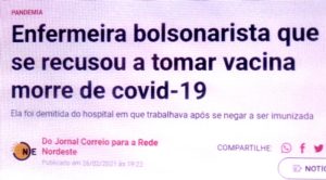 bleorgh.com – Não é motivo de comemoração, claro, mas de alerta pra tantos imbecis que, seguindo o Mito, se acham imunes à pandemia. A enfermeira Priscila Veríssimo, fervorosa bolsonarista, seguindo seu herói, se recusou a tomar a vacina “chinesa”. Morreu de covid…