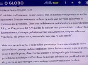 – Daí, escala o imortal Merval Pereira, porta voz político dos Marinho e mestre na arte de puxar saco, para escrever que Paulo Guedes “tem se mostrado competente na análise prospectiva de nossa economia…” mas não consegue evitar a caminhada pro abismo que Bolsonaro lidera.