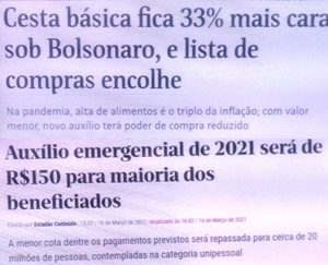 – Já o que estes necessitados precisam comprar pra comer, uma cesta basiquinha, subiu 32,56% entre o início deste ano e o mesmo período em 2019. Com R$150,00/mê, deve dar prum prato de feijão, farinha e ôvo, acompanhado de uma ou duas doses de cachaça por dia. Viva o Brasil!