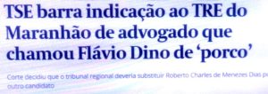 – Mesmo assim, foi indicado para o TRE/MA, o que não foi aceito pelo TSE, que justificou a negativa porque o indicado chamou o governador Flávio Dino, adversário do clã Sarney, de porco.