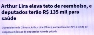 – Paralelamente, com uma canetada rápida e certeira, o presidente da Câmara aumentou em 170% o limite de despesas médicas de deputados na rede privada, de R$50 mil para R$135,4 mil, a ser pago por nós, mesmo Suas Excelências já tendo plano de saúde na Câmara. Triste Brasil!