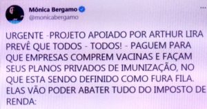 – Daí, aprovaram um projeto permitindo isto, desde que doassem pro SUS até finalizar a vacinação dos grupos prioritários. Não deu certo. Vão mudar a lei, então: empresas compram pra vacinar empregados e familiares, e recebem isenção fiscal sobre a compra. O Brasil que vá pra p..a* que o pariu!