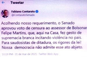 – A discussão é imbecil: ele fez um gesto obsceno ou demonstrou sua posição de supremacista branco? Resposta do Senado uma semana depois: aprovou um simbólico voto de censura a Filipe Martins. Não é atoa que o Brasil não é levado a sério!