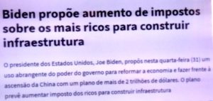 – Pra fazer frente ao poder chinês, Biden propôs um plano de 02 trilhões de dólares, no qual as corporações financiarão projetos empregando milhões de norte-americanos em obras de infraestrutura como estradas, de combate à mudança climática e em promoção de serviços sociais.