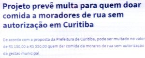 bleorgh.com – A Prefeitura de Curitiba quer que os vereadores aprovem multa de R$150 a 550,00 às pessoas e entidades que doarem alimentos aos moradores de rua sem autorização da Prefeitura. A justificativa: criar um marco regulatório pra garantir eficiência e adequação sanitária…
