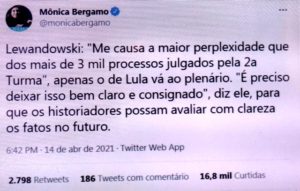 bleorgh.com – A que ponto chega a parcialidade de certos jornalistas: segundo as redes, Eliane Cantanhêde, na GloboNews, disse que, no julgamento da suspeição de Moro, Lewnadowski, indicado por Lula, substituiu a toga pela camisa do PT. Ora, ora, ora!