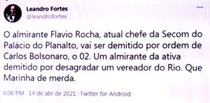 – O Carluxo é vereador no Rio, mas dá plantões permanentes no Planalto, e o almirante é um dos militates da ativa que ocupa posto civil no governo do Mito. Já houve época neste país, em que militares eram tratados com mais respeito… talvez porque eles se faziam respeitar.