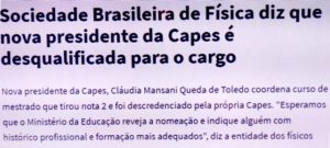 bleorgh.com – A escolhida para dirigir o CAPES, fundação do MEC que atua na expansão e consolidação dos cursos de pós-graduação do país é a síntese do que é o bolsonarismo. Pessoas escolhidas pra participarem do governo precisam ter nível intelectual inferior ao Mito.