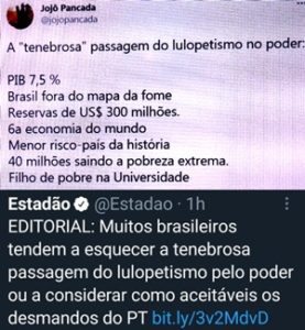 bleorgh.com – Estão aí algumas das razões porque o Estadão faz editorial lembrando a “tenebrosa” passagem de Lula pelo governo. É que o jornalão é escrito pra leitura do 1% mais rico, por quem também é sustentado financeiramente e, para esta turma, a ascensão do povo é um risco.