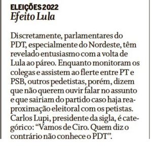 bleorgh.com – Carlos Lupi, presidente do PDT, a respeito de movimentação pró-Lula no partido: “Vamos de Ciro. Quem diz o contrário, não conhece o PDT!” Acho que todos conhecem sim… Lembram da pedetista Tábata, que votou a favor da reforma da Previdência?