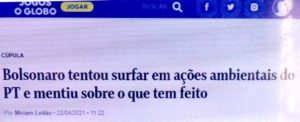 – Na Cúpula do Clima, o Mito tornou-se a própria fake news: “O Brasil está na vanguarda do enfrentamento ao aquecimento global”, disse ele, completando: “Determinei o fortalecimento dos órgãos ambientais, duplicando recursos para ações de fiscalização”. Chico Anísio revive!