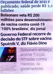 bleorgh.com – Num dia, ele veta R$2,2 bilhões pra saúde no Orçamento de 2021; no outro, ele entra com recurso no STF contra a compra da vacina Sputnik V pelos Estados e, no outro, ele veta aporte de R$200 milhões pra USP/Ribeirão Preto fabricar vacina brasileira…