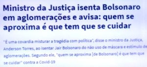 bleorgh.com – Disse o ministro (sic) da Justiça : “Se o presidente sai sem máscara e se expõe, cabe a quem está ali perto dele se cuidar.” De duas, uma: para ele, o Mito não é um lider que as pessoas costumam seguir ou, então, seus seguidores são imbecis, que não acreditam na pandemia…