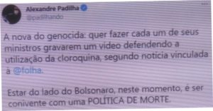 – Mandar 22 de seus ministros gravarem vídeos dizendo que tomaram cloroquina tem este objetivo. Se a CPI, a justiça brasileira ou um Tribunal Internacional julgá-lo por genocídio, sua defesa será que ele apenas acatou, democraticamente, a opinião de seus ministros…