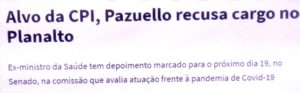 – Juristas bolsonários foram convocados e soltaram um balão de ensaio: o general não pode ser inquirido como testemunha, poi é acusado no processo da falta de oxigênio em Maaus. E, se for inquirido como acusado, pode se recusar a responder perguntas que possam incrimiiná-lo.