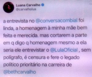 bleorgh.com – Luana, filha de Beth Carvalho, foi ao programa do Bial que prestava uma homenagem à sua mãe. Ao final, disse que a homenagem seria completa se Lula fosse ao programa, vista a postura lulista da mãe (Bial já disse que entrevistaria Lula ao vivo, mas com polígrafo).