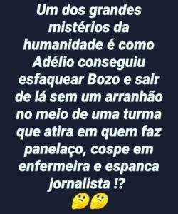 – Com oss muitos furos da simulação – falta se sangue na camisa amarela, Adélio saindo ileso da multidão fanática, a rápida transferência do Mito pra São Paulo, etc etc etc – criaram a versão de sua insanidade mental e o mandaram rapidamente pra longe da grande imprensa.