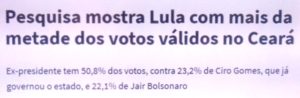 bleorgh.com – Ciro Gomes contratou um marqueteiro de 1ª linha pra sua campanha à Presidência mas, acho, que começaram com o pé errado. Pesquisa da Atlas, a pedido do jornal Valor Econômico indica que Lula hoje tem 50,4% dos votos cearenses.