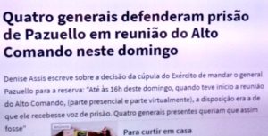 bleorgh.com – Denise Assis, no Brasil 247, diz que Diário Oficial de hoje ia circular com a notícia da reforma do general Pazuello desde 6ª feira, antes de seu ato político na motocada do Mito. Diz ela, também, que 04 generais do Alto Comando queriam sua prisão…