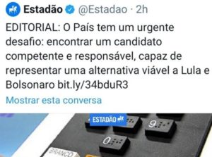 bleorgh.com – Em 2018, o Estadão apregoou que a escolha era muito difícil entre um professor e um torturador. Hoje, diz que é preciso encontrar uma alternativa viável entre Lula e o Mito, e dá a entender que o PT precisa atuar pelo impeachment do presidente.