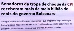 bleorgh.com – A melhor forma de se saber das pu….as* de um governo é acompanhar a imprensa amiga dos ex-amigos. A Crusoé, do fugitivo Mainardi, fanzoca do Moro, denuncia que a tropa de choque do Mito na CPI da Pandemia recebeu ½ bilhão do governo até agora.
