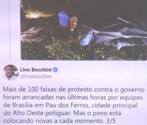 – Porque diabos então, o Mito se dá ao direito de mandar o DNIT e seu batalhão precursor derrubar outdoors, retirar faixas e fechar borracharias (pra evitar queima de pneus) em sua visita eleitoral a Pau dos Ferros/RN? O Mito, por ser mito, é inimputável? Ou é cagaço da Justiça mesmo?